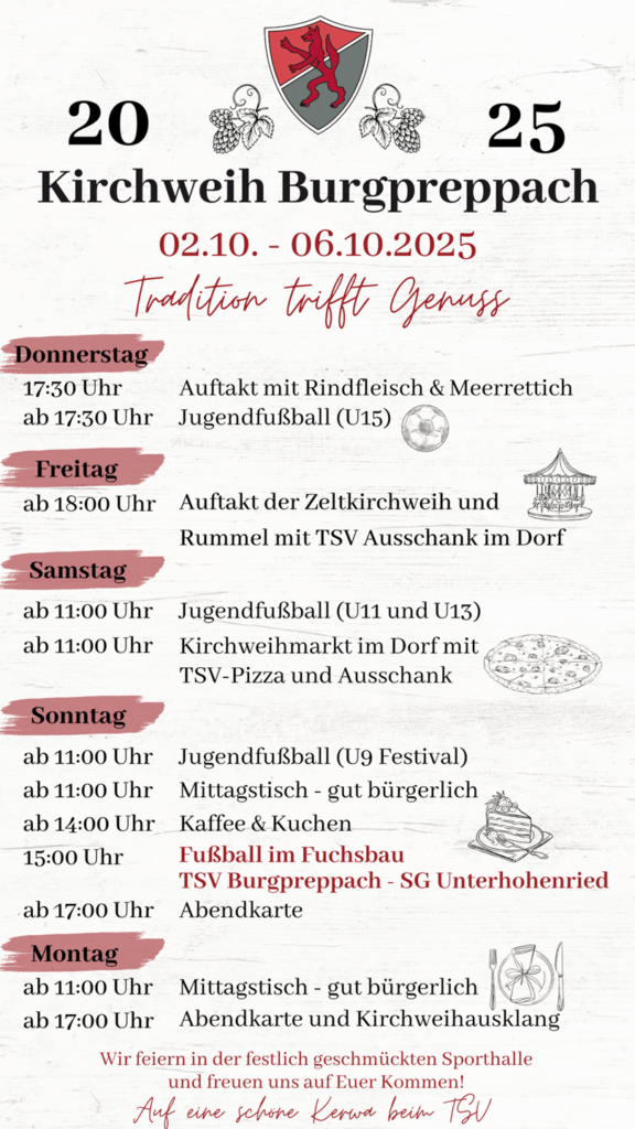 Kirchweih Burgpreppach vom 2.-6. Oktober 2025 Allgemein Veranstaltungen Wir laden Euch herzlich zu unserer Burgpreppacher Kirchweih 2025 ein. Der TSV ist wie immer voll dabei. Wir freuen uns, Euch alle zu sehen und gemeinsam zu feiern. Euer TSV 1919 Burgpreppach. TSV Speisekarte